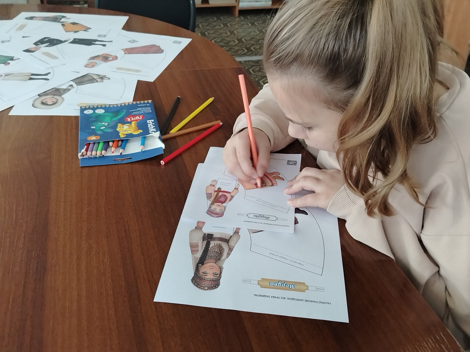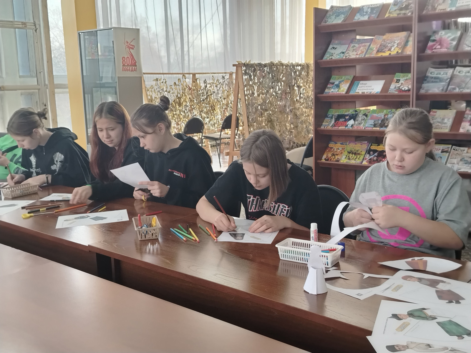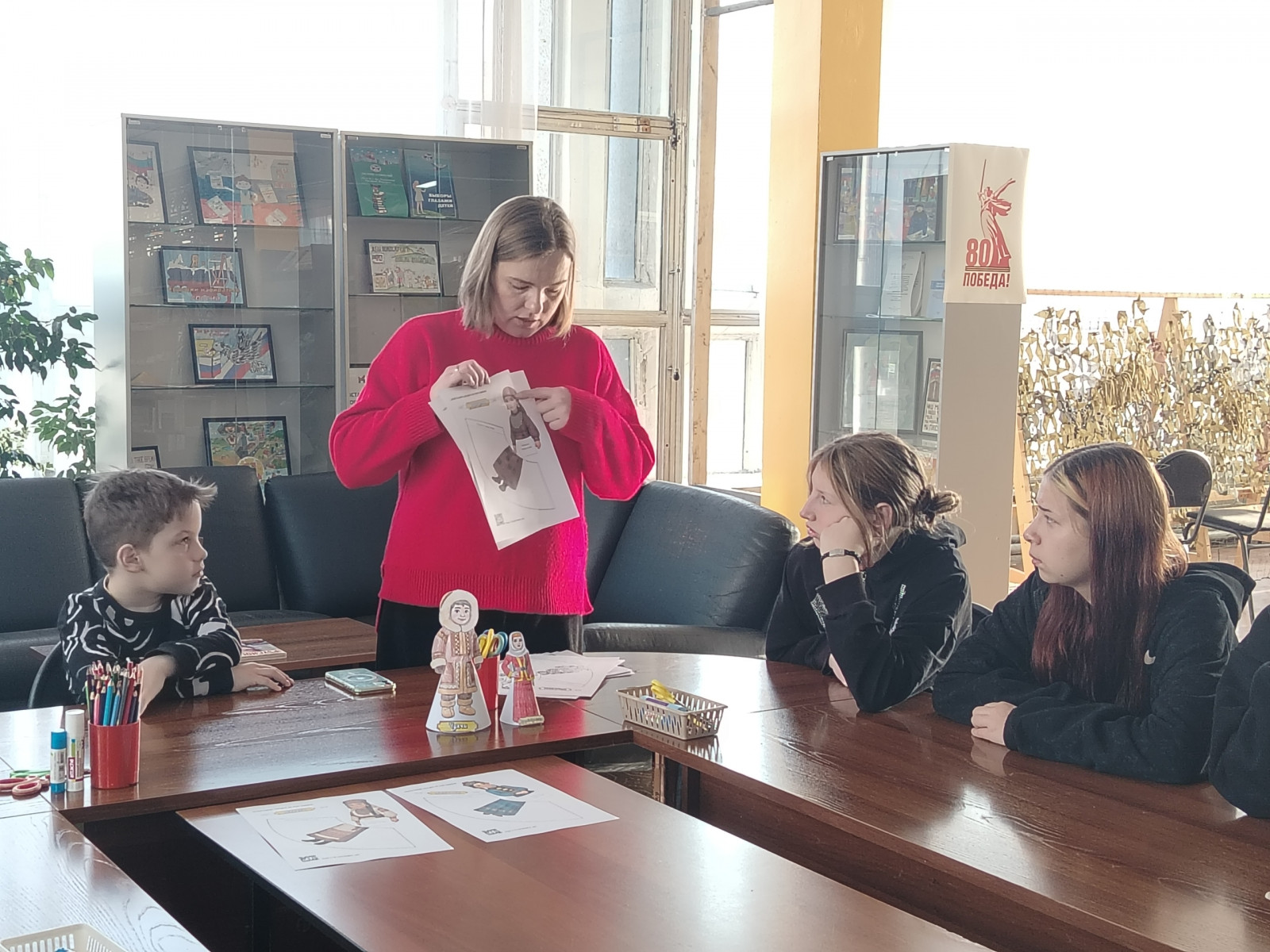 Практической частью встречи стал мастер-класс «Национальный костюм народов России», который провела педагог Центра дополнительного образования им. В. Волошиной Зорина Мария Александровна. Ребята узнали, что народный костюм — это не просто одежда, а богатейший источник творчества, объект материальной и духовной культуры. Под руководством наставника дети с большим энтузиазмом изготовили и самостоятельно раскрасили фигурки в национальных костюмах, некоторые участники успели создать целые коллекции.