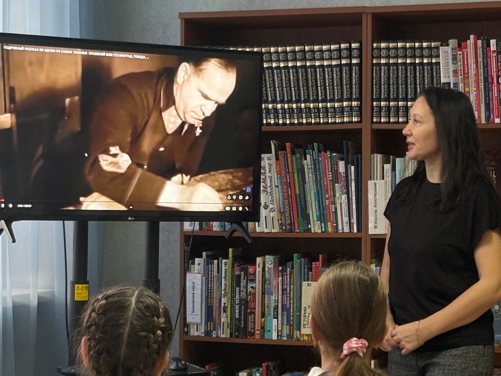 2 февраля 2026 года специалист детской библиотеки «Сибирячок» (пр. Молодёжный, 9б) в рамках проекта «БиблиоШкола» и в преддверии Дня разгрома советскими войсками немецко-фашистских войск в Сталинградской битве провела для школьников историческую информминутку «Военный Сталинград».